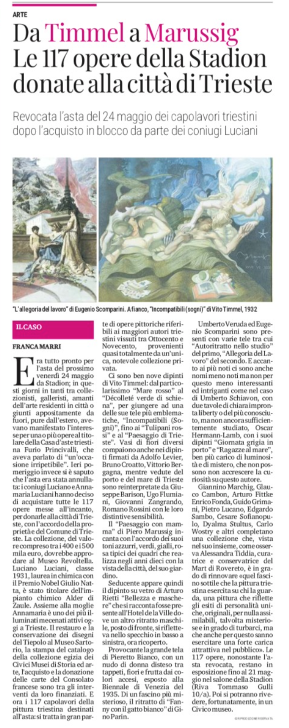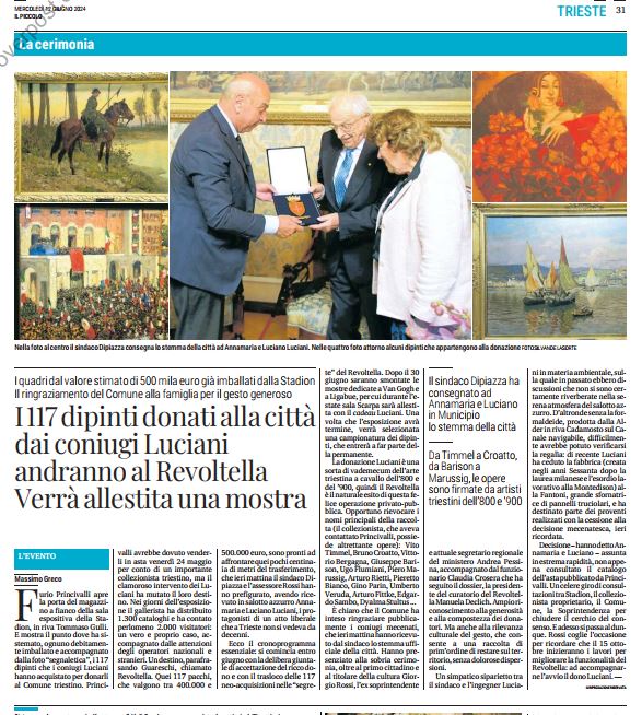 Questo munifico lascito, reclamizzato adeguatamente dai giornali locali, ha stupito non poco i cittadini triestini non più abituati a gesti di questa rilevanza. I Luciani avevano comperato in blocco il 17 maggio i dipinti d’importanza locale che avrebbero dovuti essere messi all’asta dalla casa d’aste Stadion il 24 maggio. Dopo vari confronti con la Soprintendenza che aveva ventilato la possibilità di vincolare l’intera collezione e renderla quindi indivisibile, si era deciso di accettare l’offerta dei Luciani reduci dalla vendita della loro fabbrica per la produzione di formaldeide, la “Alder”. Ciò che però rende ancora più eccezionale il fatto, è che l’intera collezione è stata messa a disposizione del Comune di Trieste con una donazione privata. Destinazione finale dei quadri: la Galleria d’Arte moderna del Museo Revoltella dove sono rimasti in mostra per alcuni mesi. L’Assessore alla Cultura Rossi ha raccontato quasi incredulo: “è stato come vincere una lotteria: si tratta di un nucleo ricchissimo di capolavori, accanto a opere minori, comunque stimabili, che appartenevano alla famiglia Irneri, i cui eredi hanno scelto di patrimonializzare, frutto di grande impegno e investimento. Ora questo patrimonio resterà alla città.”
